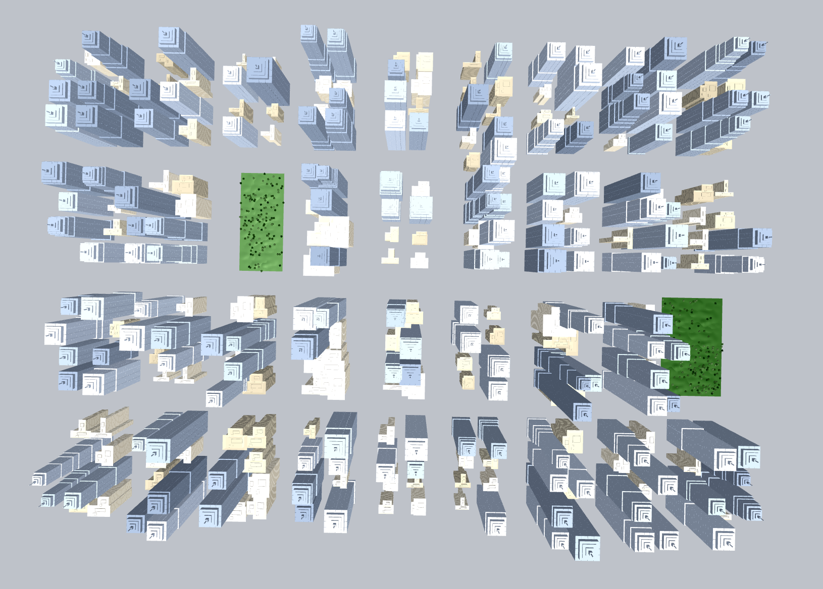 For this project, I designed a shape grammar that creates urban buildings, and designed a city layout to place the buildings generated by my shape grammar. The overall result is a procedurally generated city, which I named Suzville!